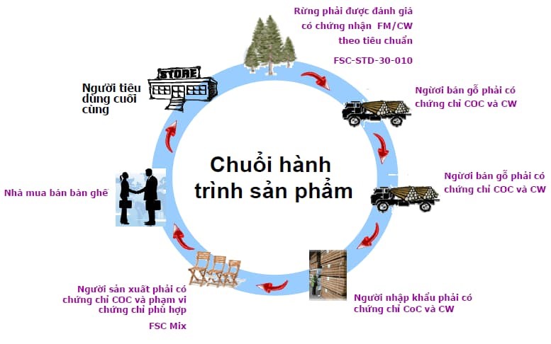 - Đây là một chuỗi quá trình từ những giai đoạn đầu tiên cho tới khi chuyển đến người tiêu dùng sử dụng sản phẩm. Chứng chỉ FSC giúp xác nhận những sản phẩm làm từ gỗ rừng có rõ ràng nguồn gốc, đáp ứng đầy đủ các tiêu chí của tổ chức FSC.